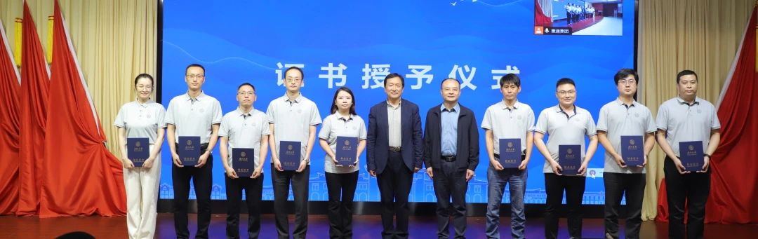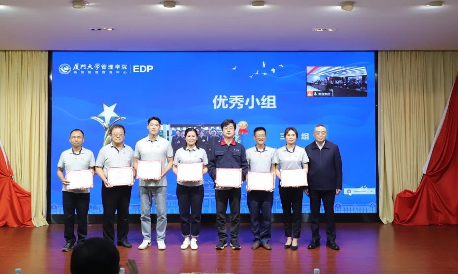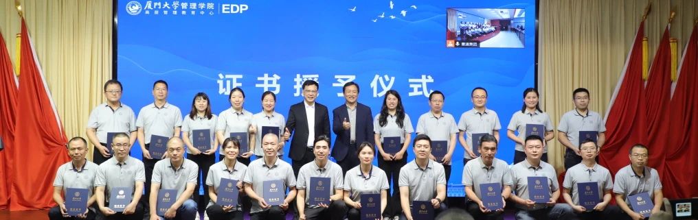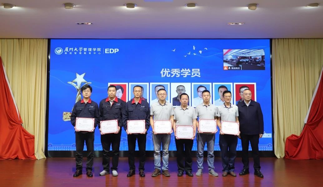 厦门大学管理学院副院长白云涛教授、EDP中心黄龙耀老师通过视频连线现场。厦门大学管理学院企业管理系木志荣教授,重庆机电股份有限公司党委委员、副总经理、董事会秘书邓瑞,IM官方网页版(集团)有限责任公司党委书记、董事长刘德永,重庆通用工业(集团)有限责任公司党委书记、董事长李华,重庆气体压缩机厂有限责任公司党委书记、董事长杨正龙参加学习汇报会和结业典礼.