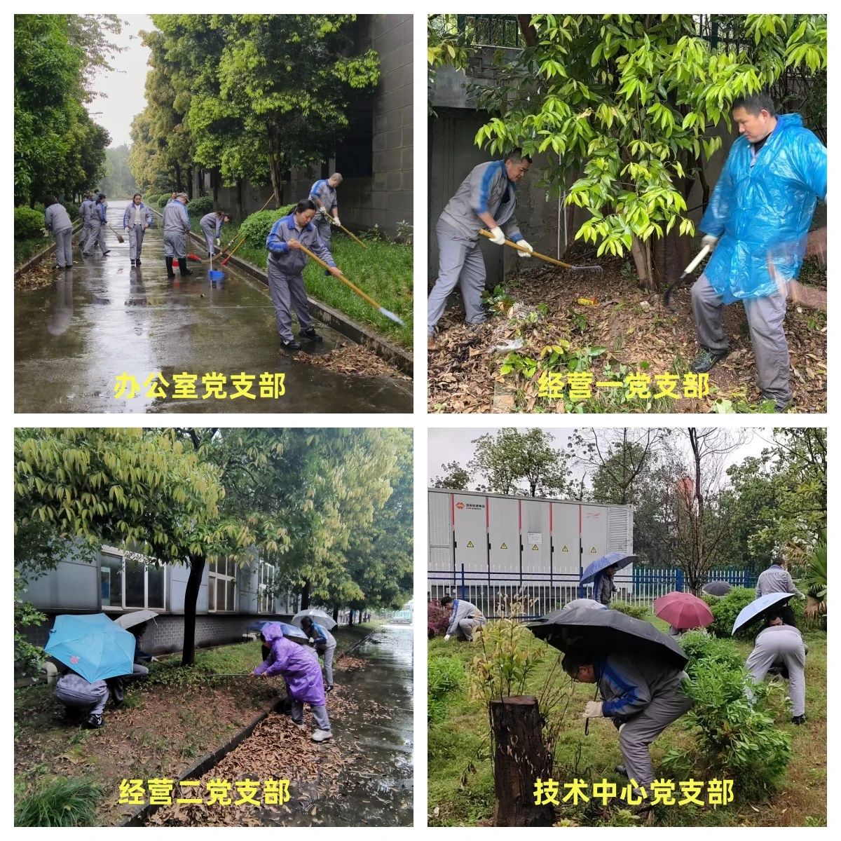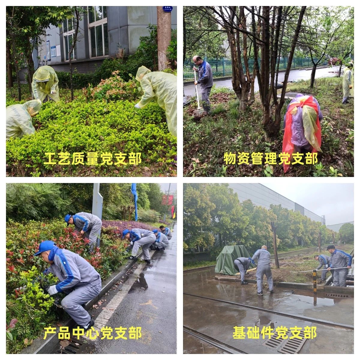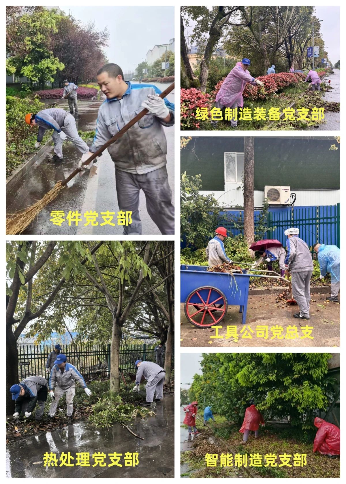 3月29日,重庆地区虽然迎来断崖式降温降雨天气,但在机床集团厂区内却是一片热火朝天的景象。由各党支部牵头,发挥党带群、党带团作用,围绕周边环境卫生薄弱环节开展清理改善行动,他们面对困难毫不退缩,早上7:30所有人开始穿戴披挂,有的人头戴工作帽、身披雨衣,有的人迎面而上,穿梭在自己的职责和区域范围。活动中有的员工直接用手拔草、有的用剪刀剪、有的用镰刀割、有的用锄头挖、有的用苕帚扫地,一个个认真细致地铲除卫生死角垃圾,一个烟头、一颗小杂草、堆积的淤泥、落叶都不放过,不一会大家头发、衣服都已经湿透,分不清是雨水还是汗水,有的员工干脆脱掉外衣后又继续干,在雨中形成了一道道美丽的风景线。在大家的共同努力下,公司公共环境清理得干干净净,看起来爽心悦目,厂区面貌焕然一新。